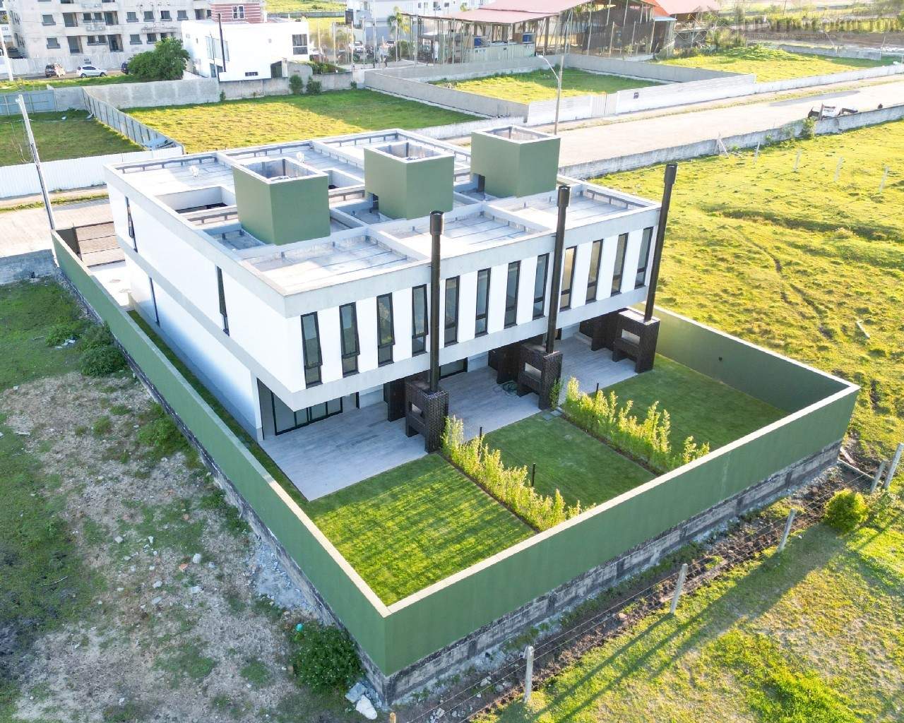 CASA 01 e 03: Com área privativa de 250m2, sendo 183m2 de área construida e 67m2 de área descoberta (jardim), a casa é voltada para o sul na fachada, norte nos fundos e oeste na lateral.